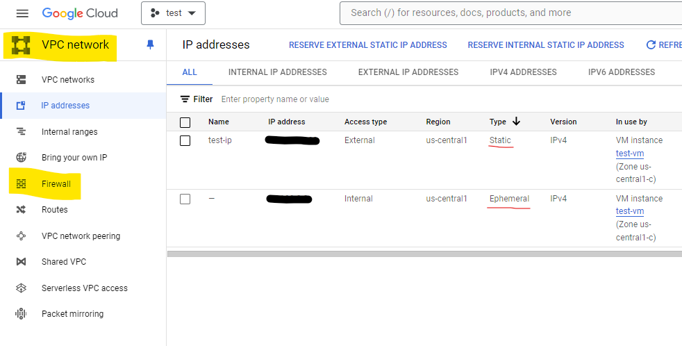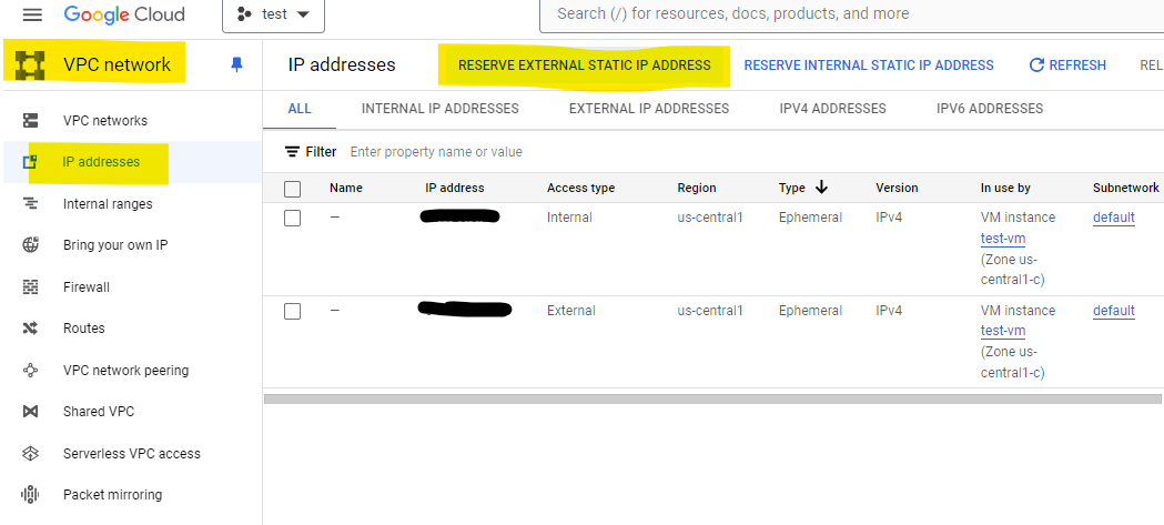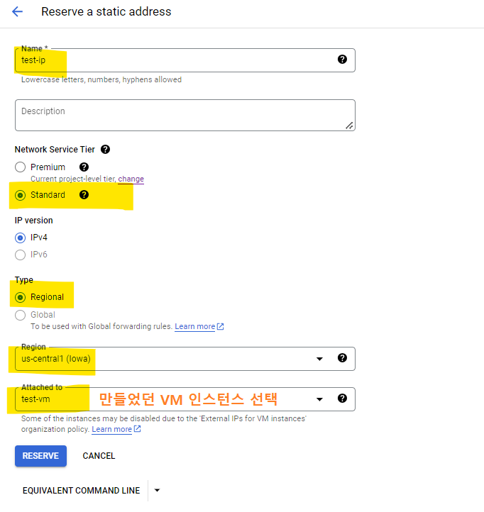 현재는 외부/내부 임시 IP로 구성되어 있으므로 외부 고정 IP를 만든다